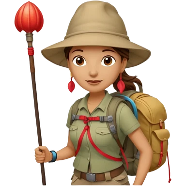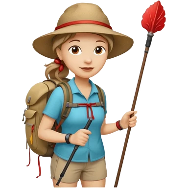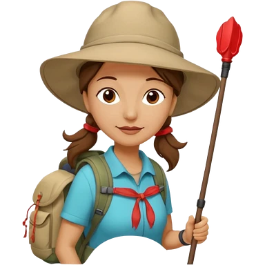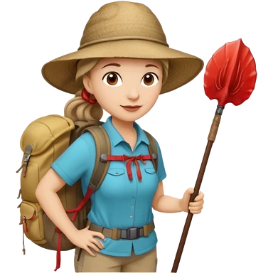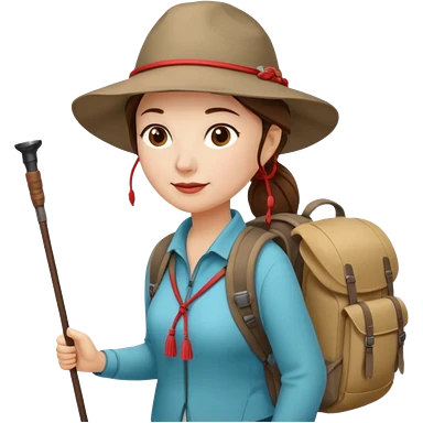 Middle aged women, long brown ponytail with wide brim hiking hat. With backpack and trekking poles. Backpack has a scallop shell with the cross of saint james hanging from it. Remove the cross and add a scallop shell on a red string hanging from the backpack emoji