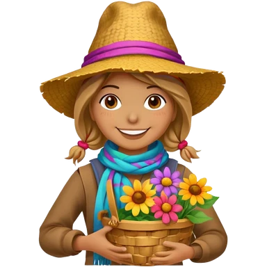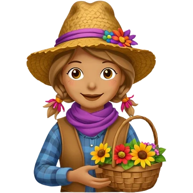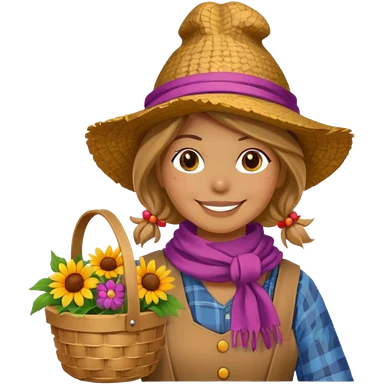 Scarecrow, Smiling face, colorful scarf, flower hat, holding a small basket. emoji | AI Emoji Generator