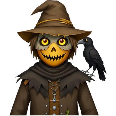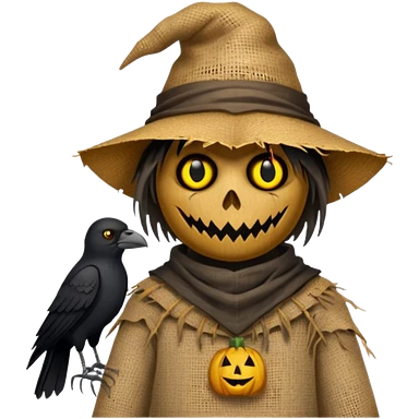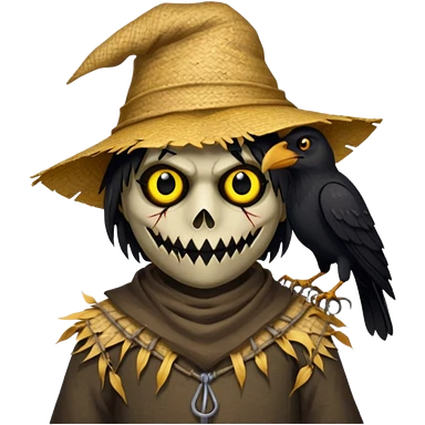 Scarecrow, Torn clothes, stitched mouth, glowing eyes, crow perched on shoulder. emoji | AI Emoji Generator