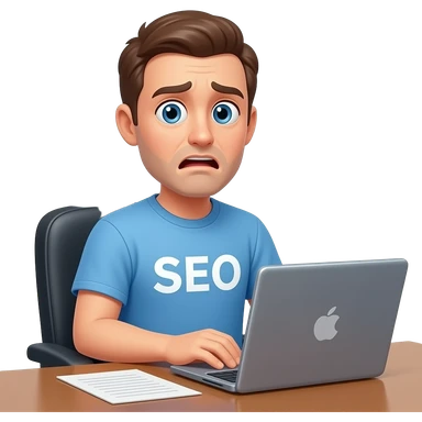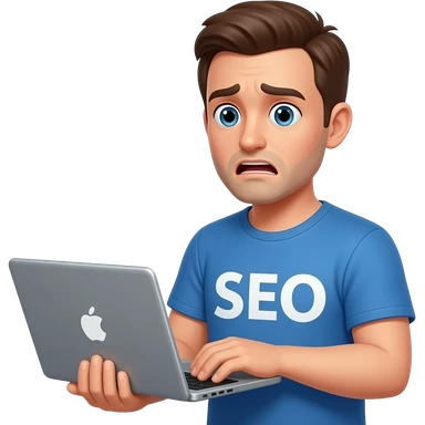 Scared man with a laptop and a shirt that says "SEO" emoji