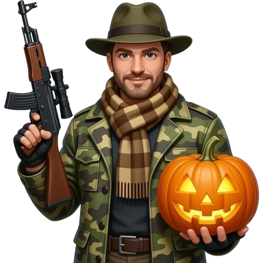 male human monster hunter emoji, wearing camo coat, hat and with rifle, holding glowing pumpkin , soft smile, scarf, , Halloween fantasy style, clean vector Apple emoji look, bright colors, square emoji