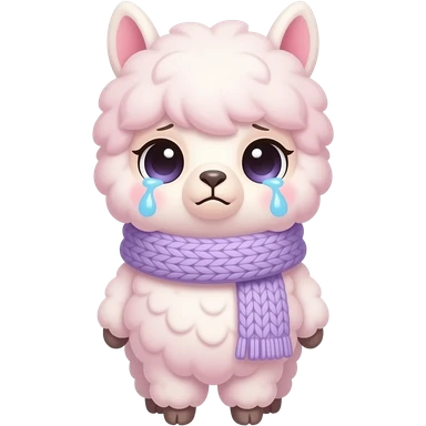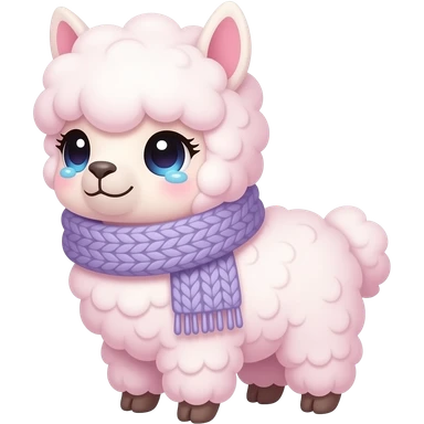 Cute chibi alpaca, soft fluffy pink-white wool, large sparkling watery eyes with tears, wearing a light purple knitted scarf, sad emotional expression, high quality anime style, cel-shaded, isolated on plain white background, sticker style, 4k, clean lines. emoji