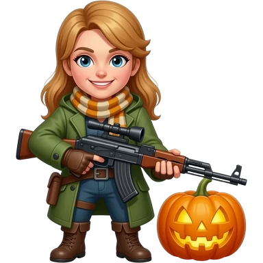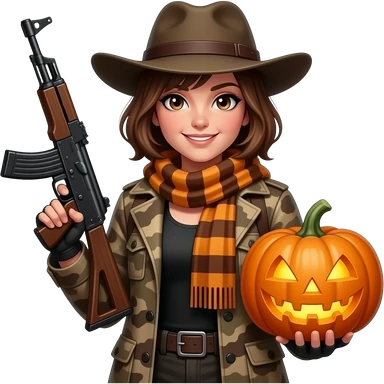 female human monster hunter emoji, wearing brown camo coat, hat and with rifle, holding glowing pumpkin , soft smile, scarf, , Halloween fantasy style, clean vector Apple emoji look, bright colors, square emoji