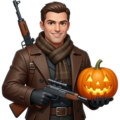 male human monster hunter emoji, wearing brown coat and with rifle, holding glowing pumpkin , soft smile, scarf, , Halloween fantasy style, clean vector Apple emoji look, bright colors, square emoji