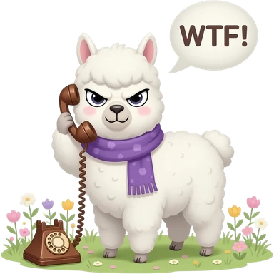 White chibi alpaca (style of image_1.png) in purple scarf, intensely angry scowling face, one hoof holding a vintage rotary phone to its ear, "WTF!" speech bubble above head, soft pastel flower meadow background, anime art style. emoji