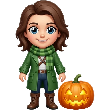 female human monster hunter emoji, wearing green coat and, soft smile, scarf, glowing pumpkin by her side, Halloween fantasy style, clean vector Apple emoji look, bright colors, square emoji