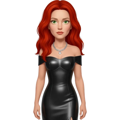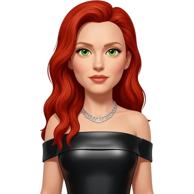 Scarlett Johansson with green eyes, long red hair, black metallic off shoulder long dress, silver necklace emoji