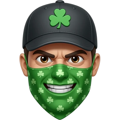 scary face of a hooligan wearing a cap with ☘️ on it and a green bandana around his face emoji