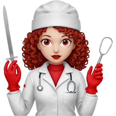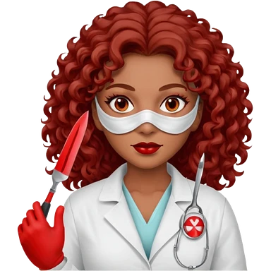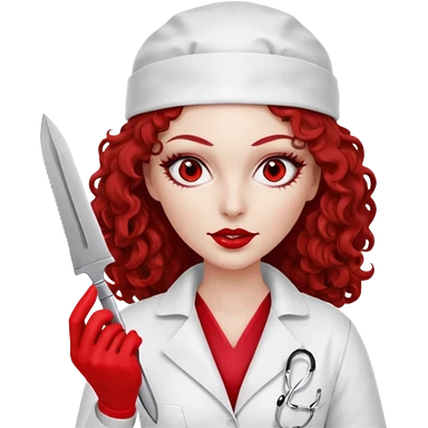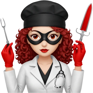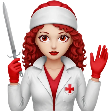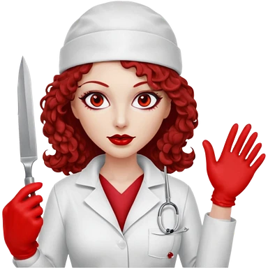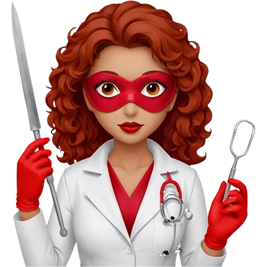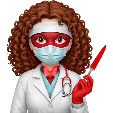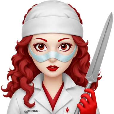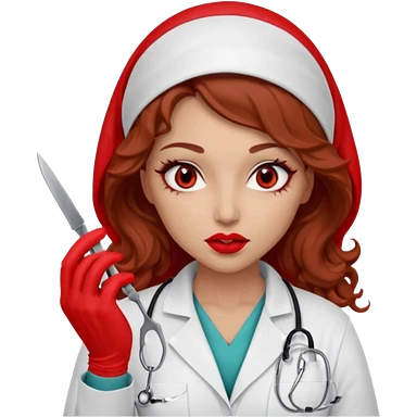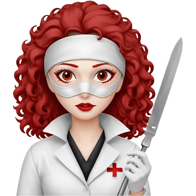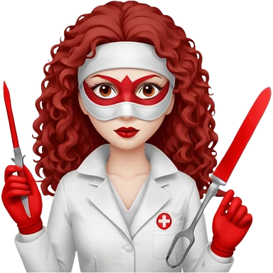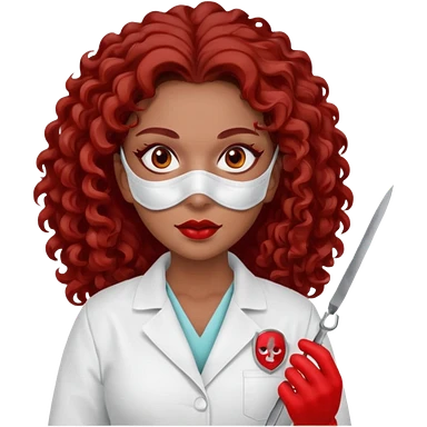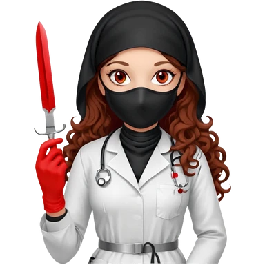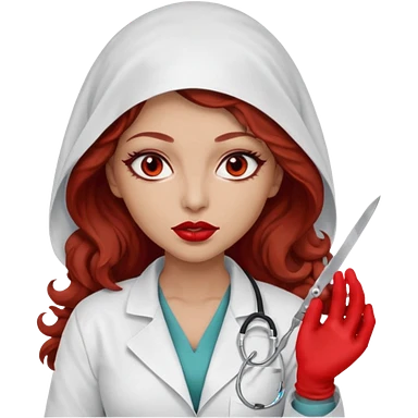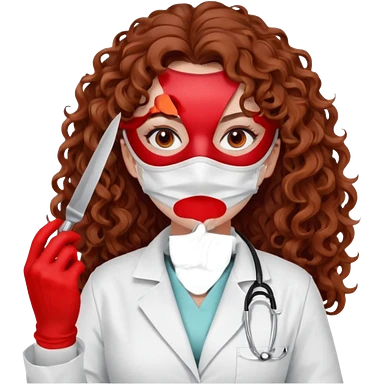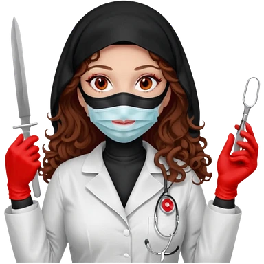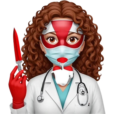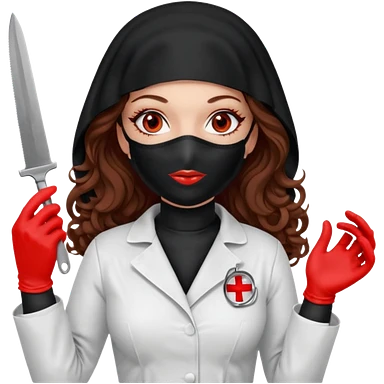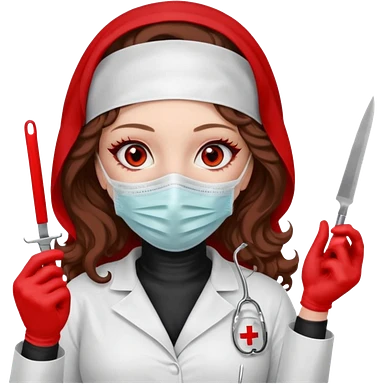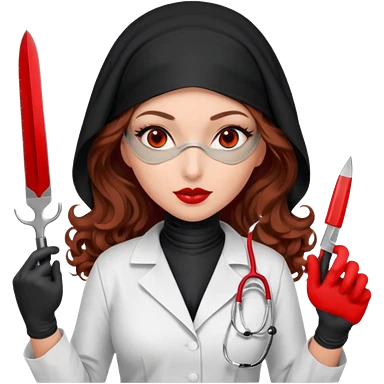 Scary woman scalpel in hand, evil surgeon sexy surgeon clothes. She has red eyes. Her brown long curly hair. Wears sexy doctor outfit with red gloves. make her hair free and brown but have mouthy wear mask to hide. Wears white surgeon jacket and face under a veilemoji