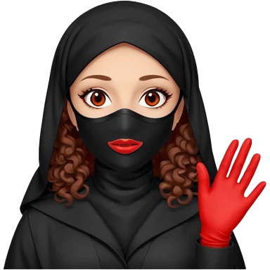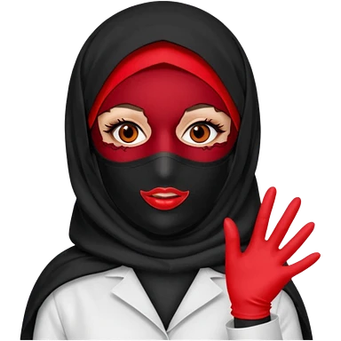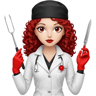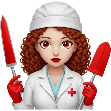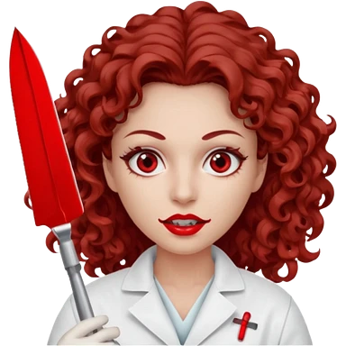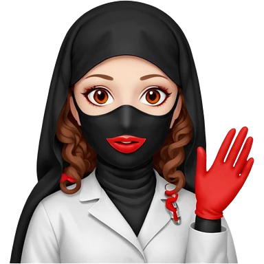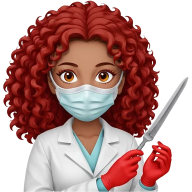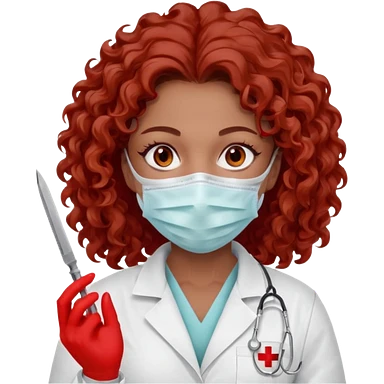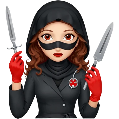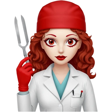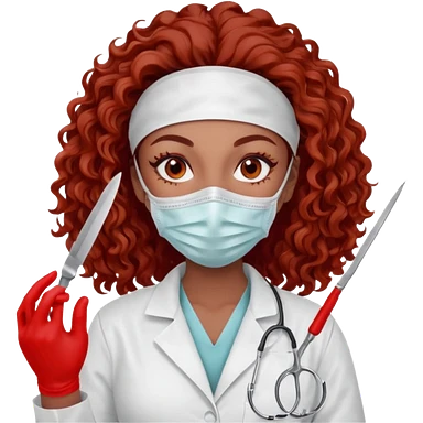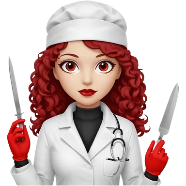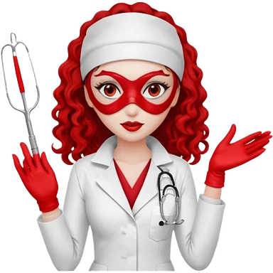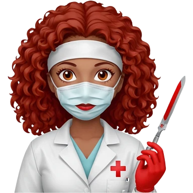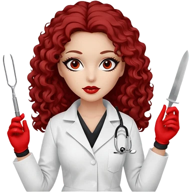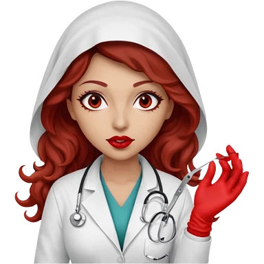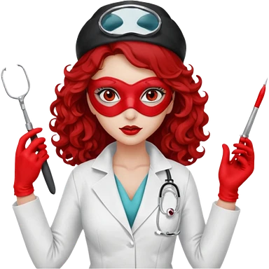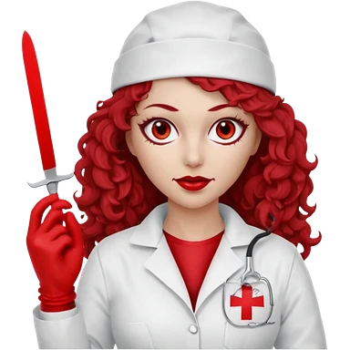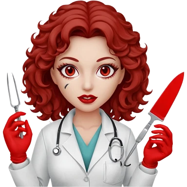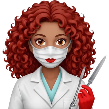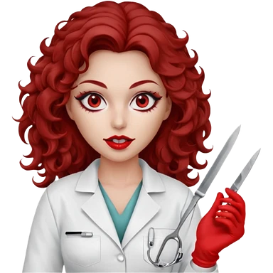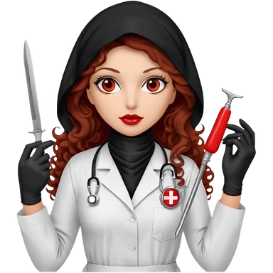 Scary woman scalpel in hand, evil surgeon sexy surgeon clothes. She has red eyes. Her brown long curly hair. Wears sexy doctor outfit with red gloves. make her hair free and brown but have mouthy wear mask to hide. Wears white surgeon jacket and face under a veilemoji