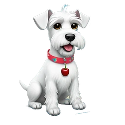 White mini schnauzer on surf board wearing a cherry collar emoji