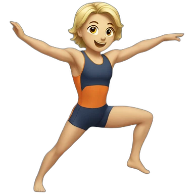 A skilled acrobat performing a handstand with perfect balance, while another acrobat gracefully flips in the air, showcasing their strength and precision. The background features a large gymnasium with bright lights and cheering audience, symbolizing adult acrobatics as a coordinated sport. emoji
