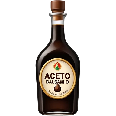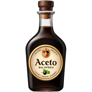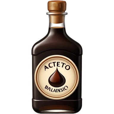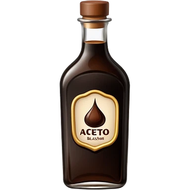 elegant glass bottle of balsamic vinegar, dark brown or ruby liquid, round or square base, slender neck, cork or metallic cap, dark glass with reflections, blank label optional, 3D clean style, transparent background emoji