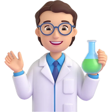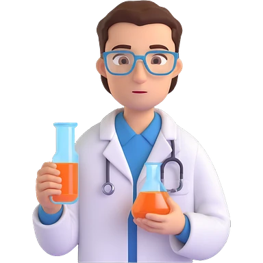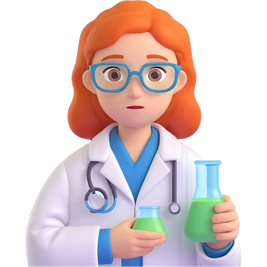 Add scientist glasses to the cartoon chick in a bathrobe holding chemical flasks and tubes, 3D style, no background. emoji