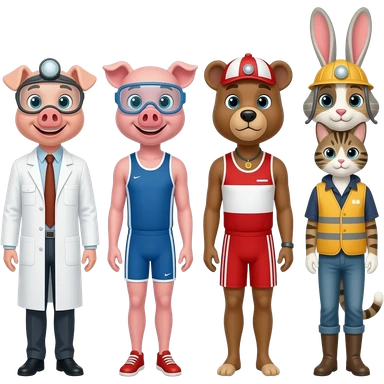Scientist pig, athlete pig, lifeguard bear, tailor dog, miner rabbit, and shepherd cat emoji