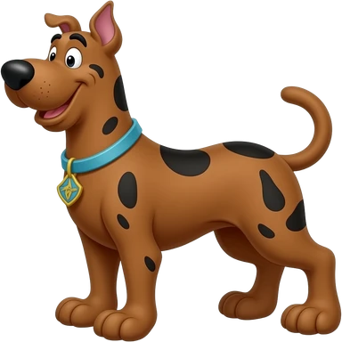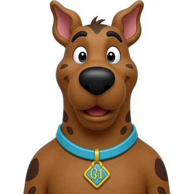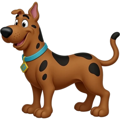 scooby doo, brown large great dane with blue collar diamond shaped dog tag with gold s in middle emoji