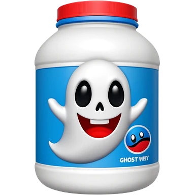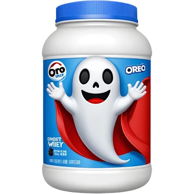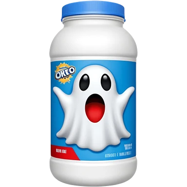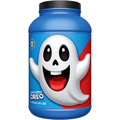 “Front-facing Ghost whey protein powder bottle, tall white plastic tub with wide shoulders and bold red lid. Blue and black Oreo-inspired label with the white GHOST logo and small ghost mascot. Clean studio lighting, soft shadow, realistic emoji-style product, centered on white background.” emoji