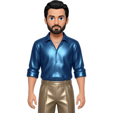 Oliver Reed with black hair, black sequin baggy pants, shirtless with necklace emoji