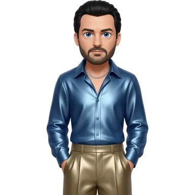 Oliver Reed with blue eyes, black hair and short beard, steel blue metallic shirt, taupe metallic baggy pants, silver necklace emoji