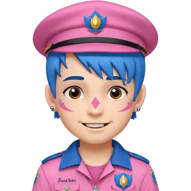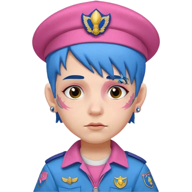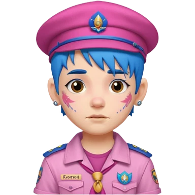 scout boy with very pink scout uniform, blue haired and hat, heavy face attoed emoji