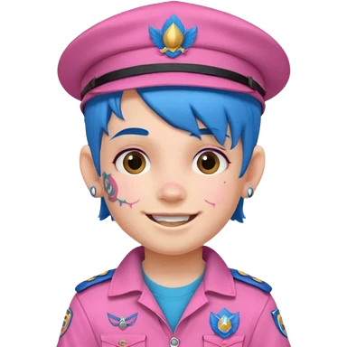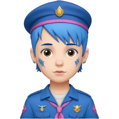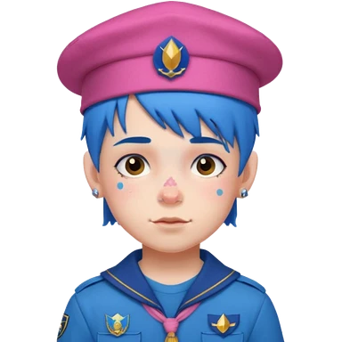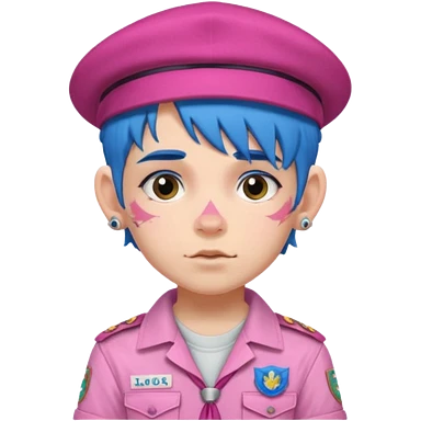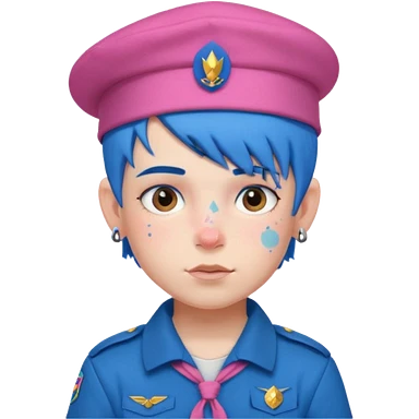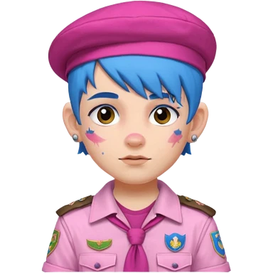 scout boy with very pink scout uniform, blue haired and hat, heavy face tattoed emoji