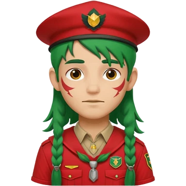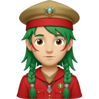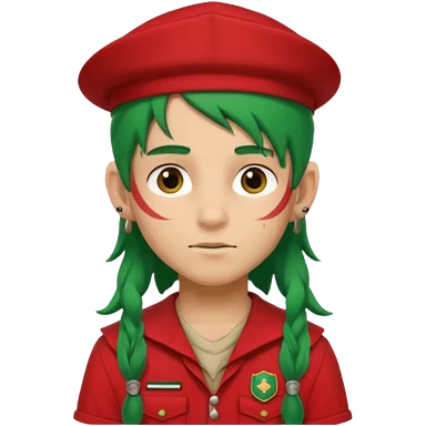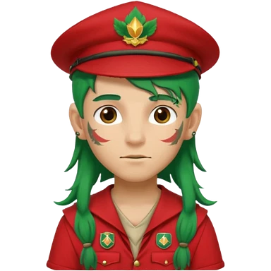 scout boy long hair face tatooes green haired, wearing red uniform with hat emoji