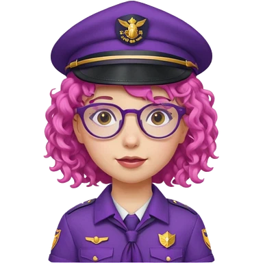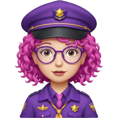 scout girl with pink curly hair and uniform and hat and glassess and purle uniform emoji