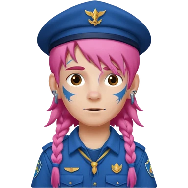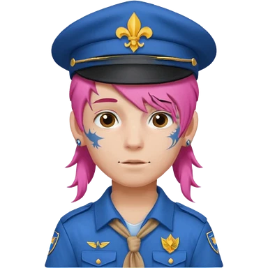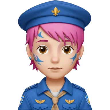 scout boy long hair face tatooes pink haired, wearing blue uniform with hat emoji