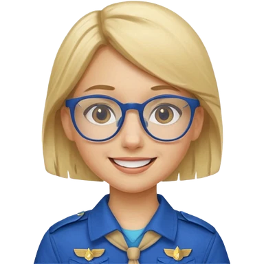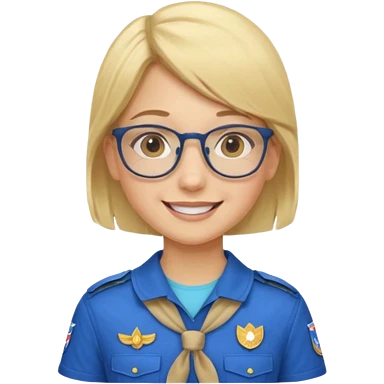 scout girl with blue scout uniform including hat, blonde curly haired and glassess emoji