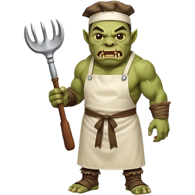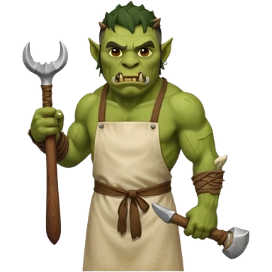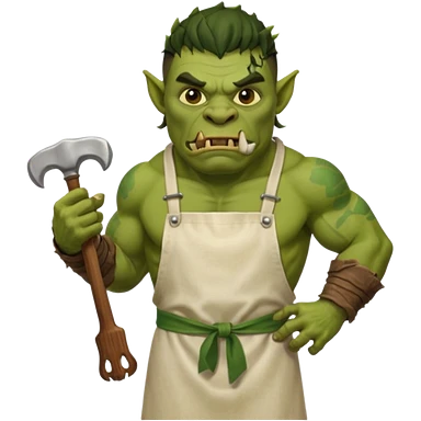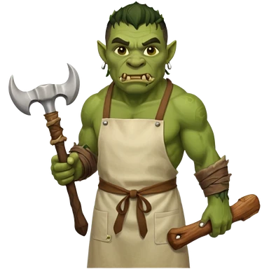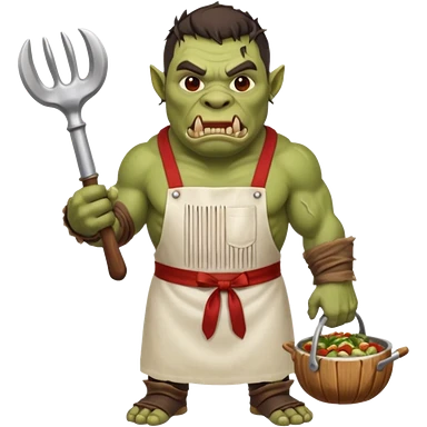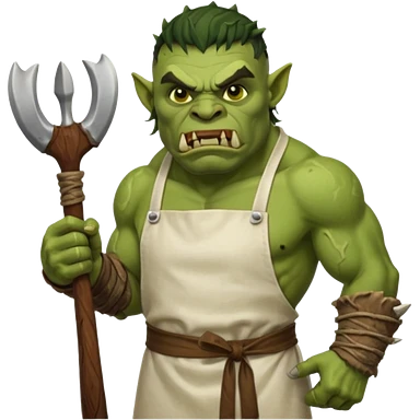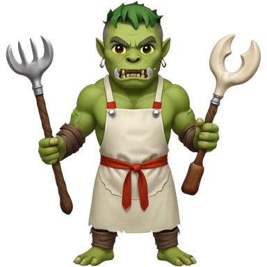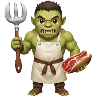 orc male Apron with "Kiss the Cook" (scratched out, replaced with "Fear the Cook"), giant rib bone as a weapon. emoji