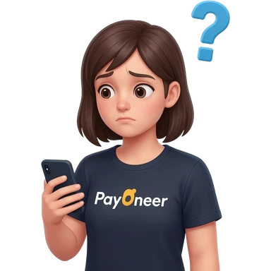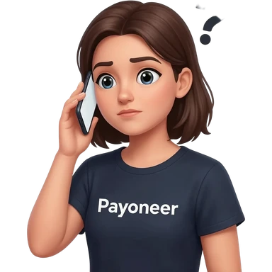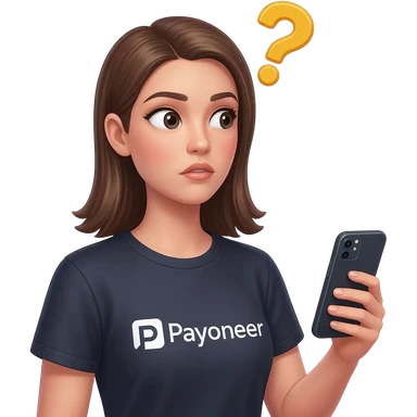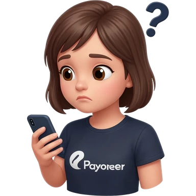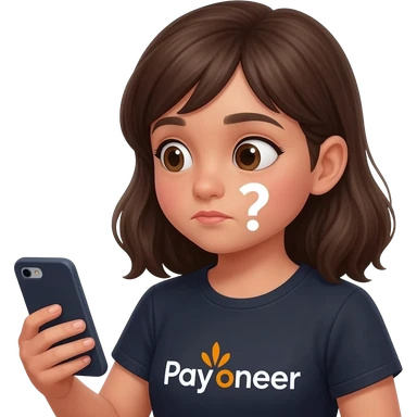Girl looking at her phone with wondering face and a question mark wearing dark tshirt with payoneerwritten on it emoji