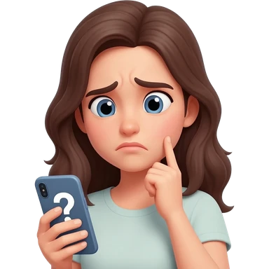Girl looking at her phone with wondering face and a question mark emoji