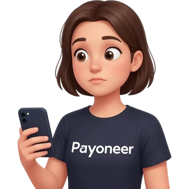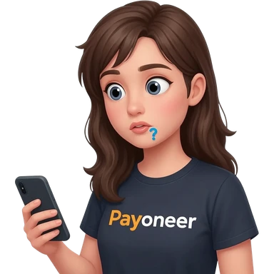 Girl looking at her phone with wondering face and a question mark wearing dark tshirt with payoneer written on it not a logo, just a word in the same font as on logo emoji