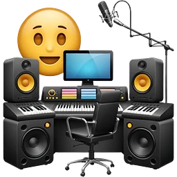 Create a creative and inspiring emoji that represents writing music tracks. The design should feature musical notes, a pen or pencil, and a digital audio workstation (DAW) interface or a computer screen with a visible waveform, symbolizing the process of composing and arranging a track. Add elements like a metronome or a pair of headphones to reflect the recording and editing aspects. Use vibrant colors like electric blue, purple, or neon green to represent creativity and innovation in music production. The background should be transparent. emoji