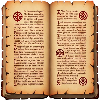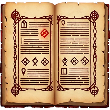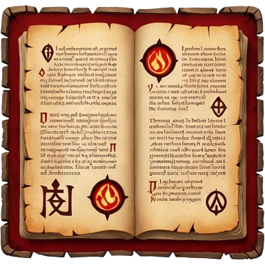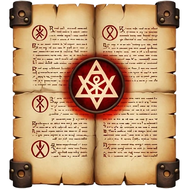Ancient scripture page burned at the edges, cursed runes glowing faint red emoji