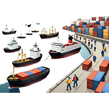 A 3D cartoon cargo or passenger seaport terminal with cranes and ships docked, calm lighting, Memoji-style realism. emoji