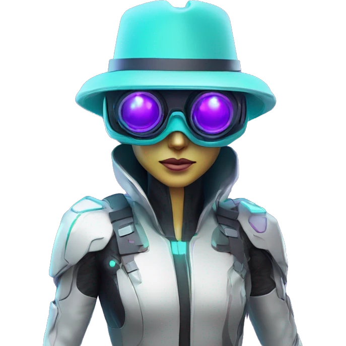 Secret humanoid agent in a futuristic hat with in Apple VR goggles headset code display on the goggles , cyberpunk, cyan and purple colors, only upper body portrait, front facing the camera emoji | AI Emoji Generator
