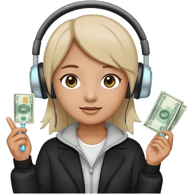 cute emoji style illustration of a K-pop fan holding a bright lightstick in one hand and cash money bills in the other hand, wearing a large headset on the head, round face, simple eyes, flat vector style, soft colors, transparent background, clean outline emoji