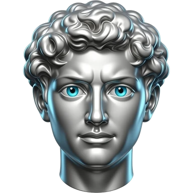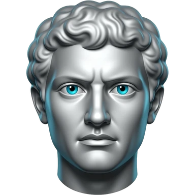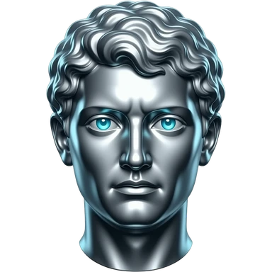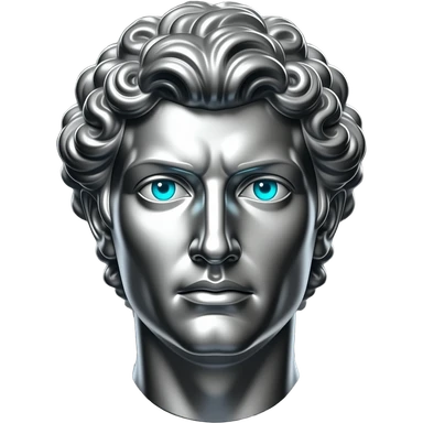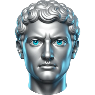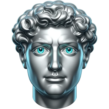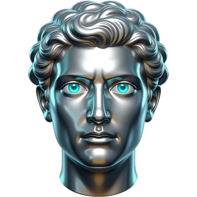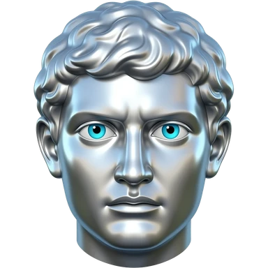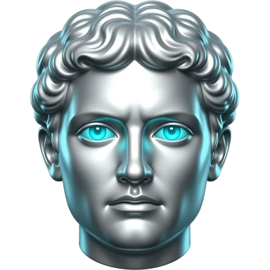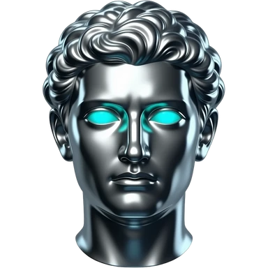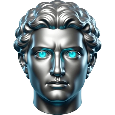 "A polished chrome german men statue head, front-facing, serious focused expression, glowing cyan (#00D4B1) eyes, dark background. Metallic reflections with subtle cyan light accents. Clean, no background, emoji style, high detail. The statue represents discipline, focus and self-mastery." emoji