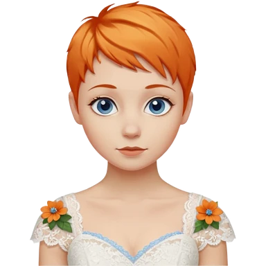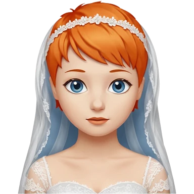 27 year old woman, orange hair, pixie cut, blue eyes, wedding dress emoji