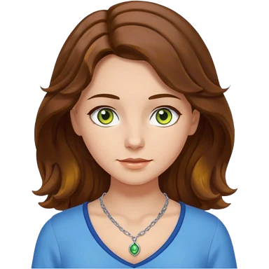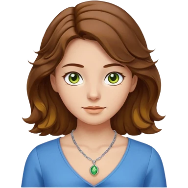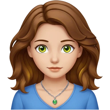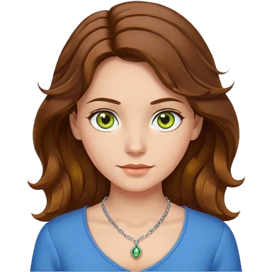 girl with brown, wave, middle hair, green- yellow eyes in white top with blue blouse and selver necklace emoji