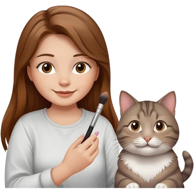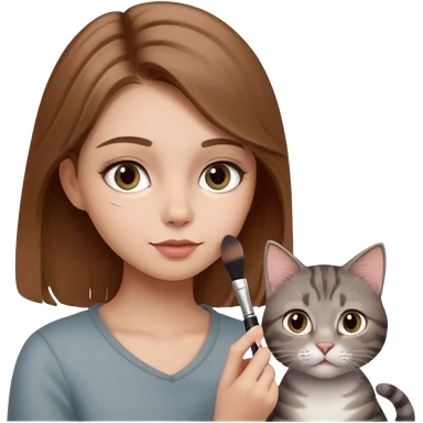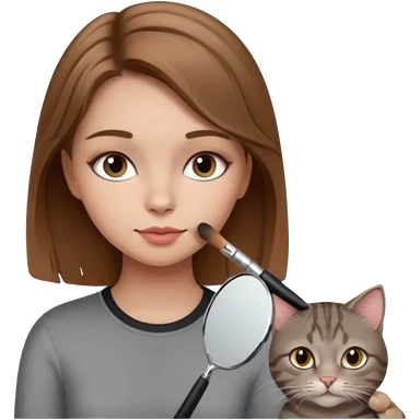 A image of a girl with light brown hair doing her makeup with her grey tabby cat emoji