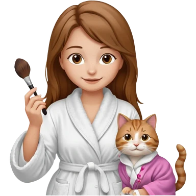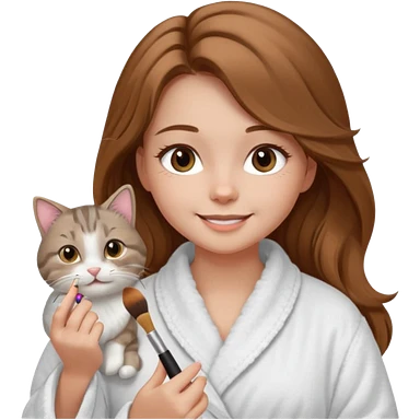 A image of a girl with light long brown hair wearing a bathrobe doing her makeup with her chubby grey tabby cat. She is smiling emoji
