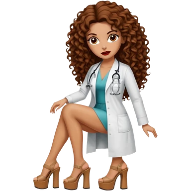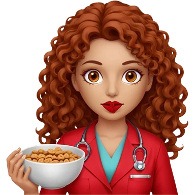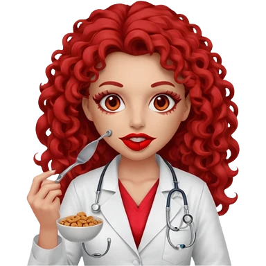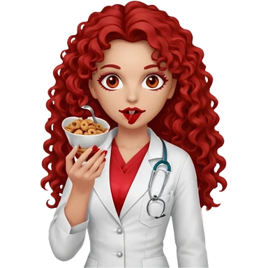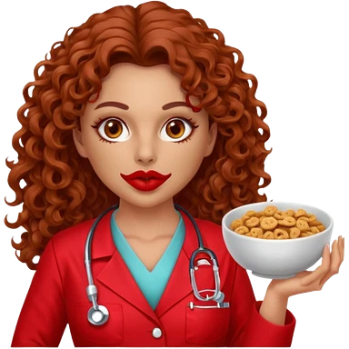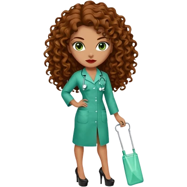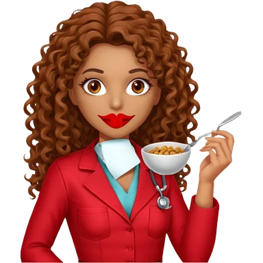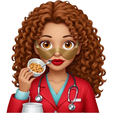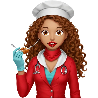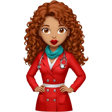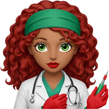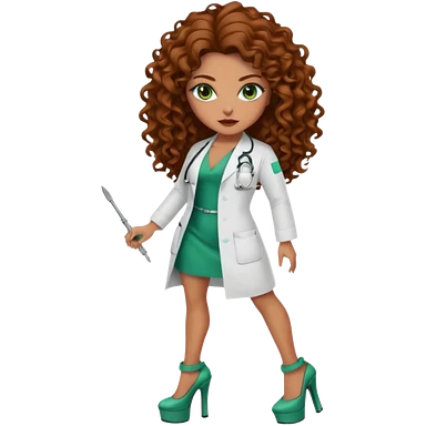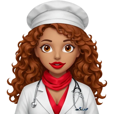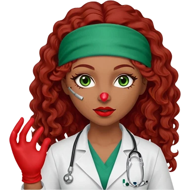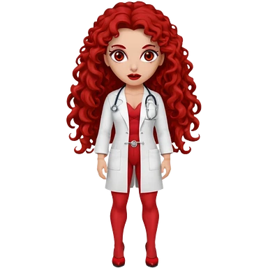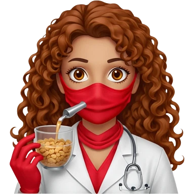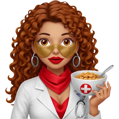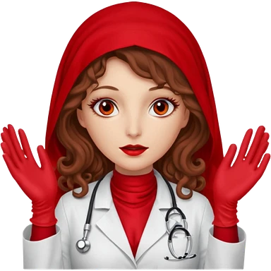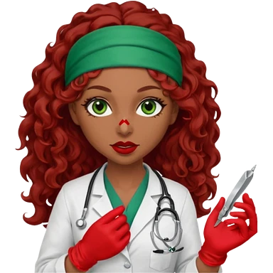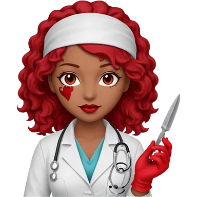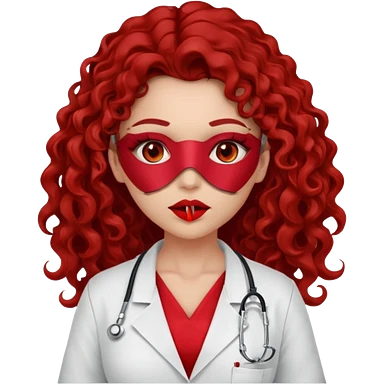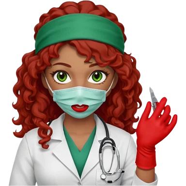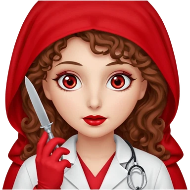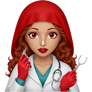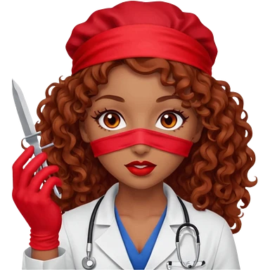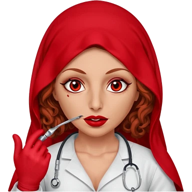 Sensual Spanish Lilith core evil surgeon.red outfit. Surgeon has hazel eyes. Her hair is BROWN. Hair is also long and curly. wearing a sexy surgeon outfit with platform heels.she is a calculated smart killer. She covers only her mouth and nose with silk scarf to hide identity emoji