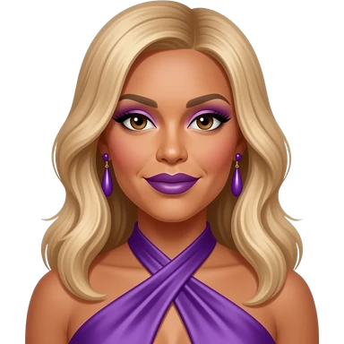 Wendy Williams with dark brown eyes, long golden blonde hair, purple eyeshadow dark purple lipstick, purple silk halter dress, purple earrings emoji