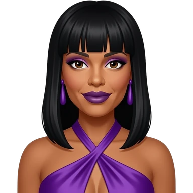 Wendy Williams with dark brown eyes, long black 90s bang hair, purple eyeshadow dark purple lipstick, purple silk halter dress, purple earrings emoji