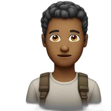 The person(male) has a tanned complexion, wavy dark hair covering his forehead, well-defined facial features with a strong jawline, full lips, and serious expression. They are wearing a white shirt layered with a brown jacket emoji