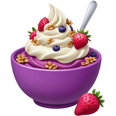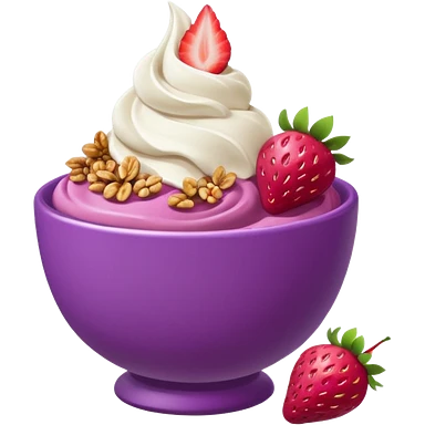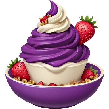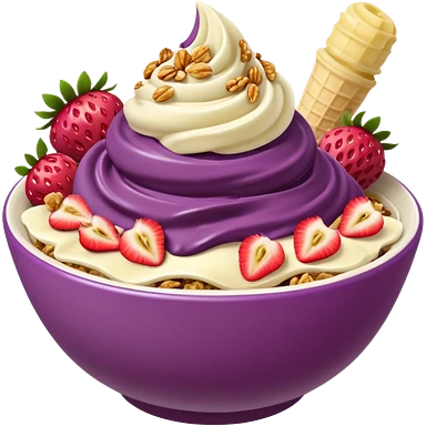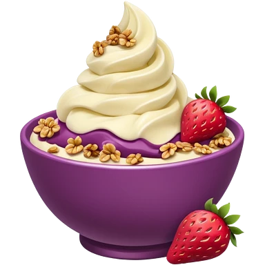 acai purple soft serve in a bowl strawberries and granola and chopped banana emoji