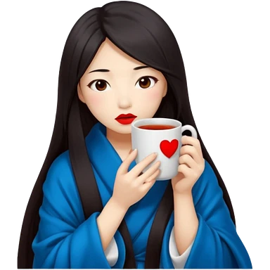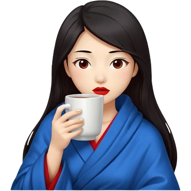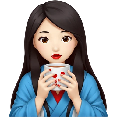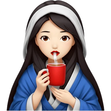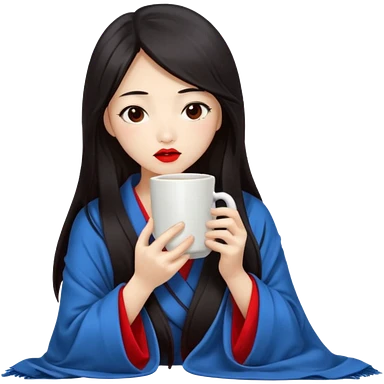 sexy asian japanese girl, red lips, long dark hair, feeling ill, sickness, nose is red due to sickness, head and body covered by blanket, holding tea mug in hands emoji