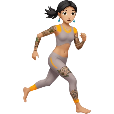 sexy nude asian girl with slightly tan skin, tattoes and earrings running, nude feet emoji